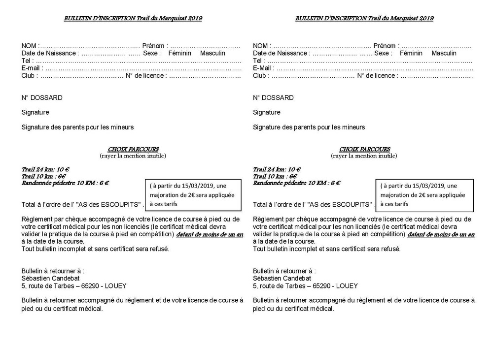 Bulletin à retourner à : Sébastien Candebat, 5 route de Tarbes – 65290 – LOUEY