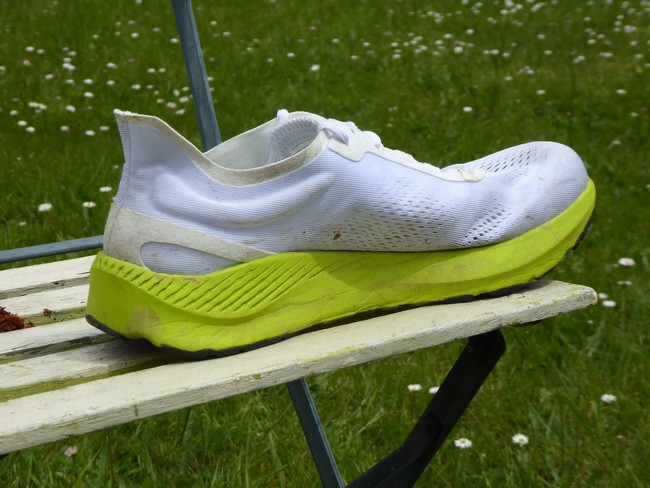 Le drop 5 mm sur ce modèle me semble bien ajusté, du moment où le talon pourra « servir » ou dépasser en cas de fatigue sur les longues distances. Un drop 25/20 mm voir 23/18 mm équilibrerait un peu mieux les « forces » : le bloc semelle réserve la majeure partie du poids, et au bout d’une longue jambe fine, ce n’est pas l’idéal. Des coureurs aux jambes plus courtes et plus fortes sentiront moins cela, possiblement.