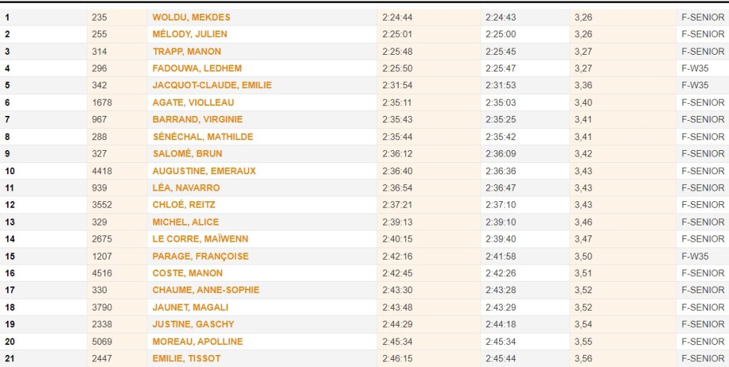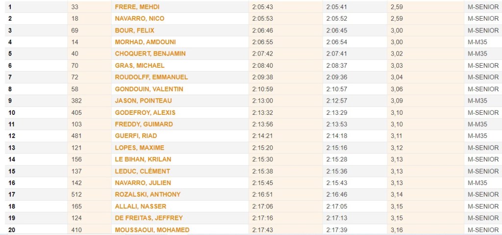 On a du mal à se rendre compte ce qu’est une allure de 2h01, ou même de 2h15, tellement il y a du monde et du niveau. Quasiment 2’53 / km, soit presque 21 km/h… C’est démentiel ! Le top niveau mondial est là. Le top niveau français aussi. Il n’y a qu’à voir ces tops 20 !