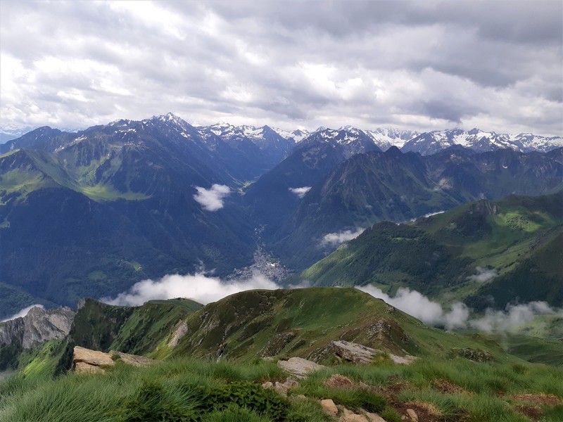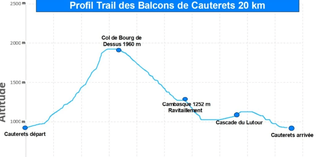 Départ place de la mairie à Cauterets (940 m). La première partie est commune au 20 km. Direction la ferme Igau et ça va monter vers le col de Bourg Dessus (1960 m). Longue montée de 1000 m+ environ sur 6 km. La vue sur la vallée vaut le coup ! Ensuite, descente en direction du Cambasque (1250 m), 1er ravitaillement.