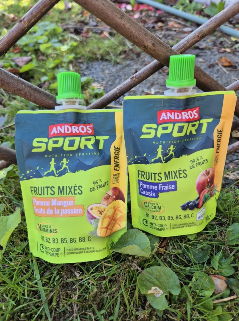 Du coup, on se retrouve désormais pour le test, non pas des compotes, mais des différents produits énergétiques pour le sport qui seront bien sûr très connotés fruits. Andros Sport est créé récemment, et soutient déjà un traileur très connu : Germain Grangier.