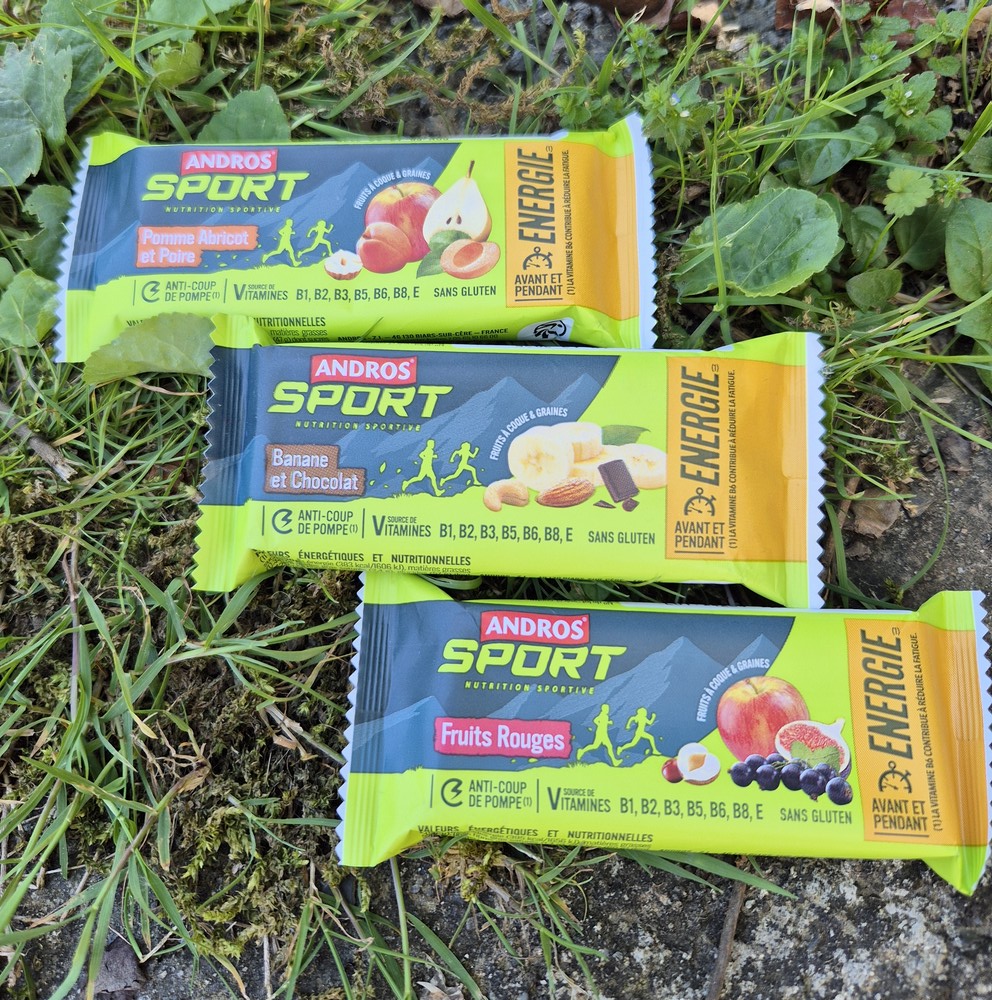 - Barres énergétiques (banane/chocolat – fruits rouges) : pas mal de sucre bien sûr mais aussi du potassium et des fibres. C’est à prendre pendant l’effort, plutôt long. La barre ressemble à tout ce qui se fait de plus naturel (pas les barres de céréales avec des agglomérants). Donc c’est plutôt consistant et ça va vous demander de boire. Cela dit, l’effet énergétiques est là. Pas de gluten. Avis subjectif : le goût top des fruits rouges qui stimule bien.