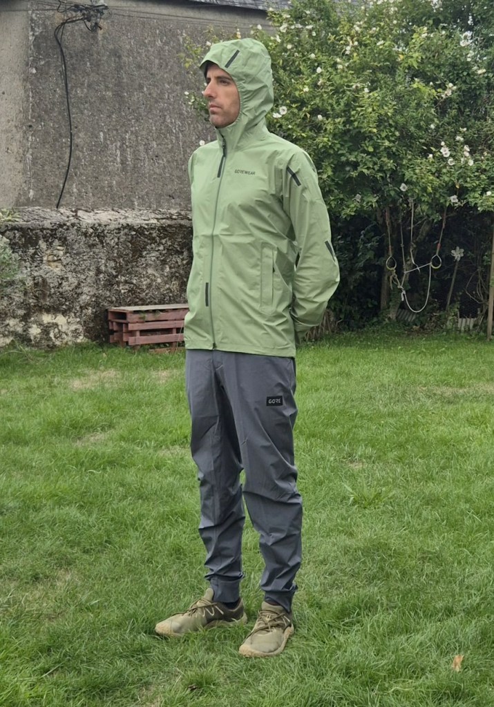 C’est vrai que le produit est léger et la matière peu épaisse pour de l’imperméable. On remarque très vite la « patte » Gorewear avec les finitions : la coupe est plutôt près du corps, le fit sur les manches est resserré, avec une partie de la bordure élastiquée, les zips (poches et veste) sont protégés par un repli de la membrane, la capuche comporte une légère bordure pour accentuer le maintien, le tour de taille est proche du corps, et dans chaque plan, des éléments réfléchissants permettent d’assurer la visibilité. Sobriété et sens du détail !